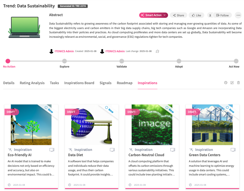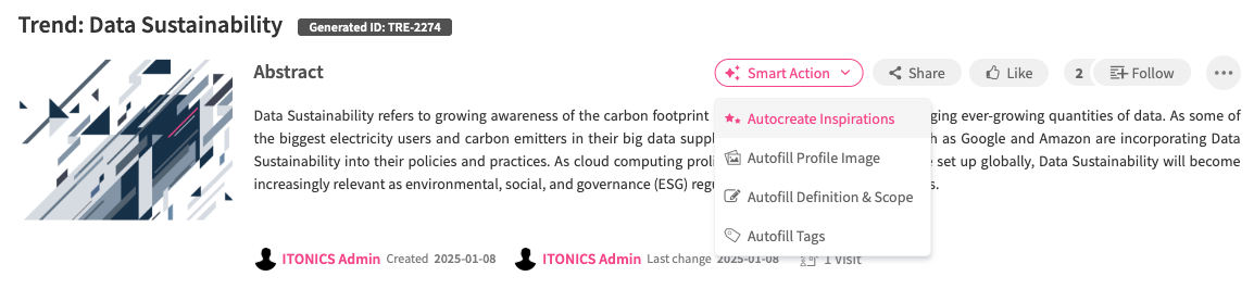 To facilitate the creation of child elements, e.g. as food for thought for users to come up with relevant ideas for child elements of a parent, or to simply leverage artificial intelligence (AI) to generate relevant content faster, you can make use of the Smart Creation feature to let the ITONICS Innovation OS create and fill out required information for you. If the module is enabled, on the detail page of the parent element, navigate to the Smart Action button and select the Autocreate child element dropdown option (in this example, Inspiration is the child entity type configured for the parent entity Trend).