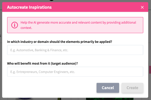 Clicking the option opens the Autocreate modal, where you are prompted to provide some input on the target industry or domain, and target audience. Together with the Title and Abstract information of the underlying parent element, the AI will utilize these as context information to autogenerate child elements. Once you have entered your inputs, confirm the generation of the elements by clicking Create.