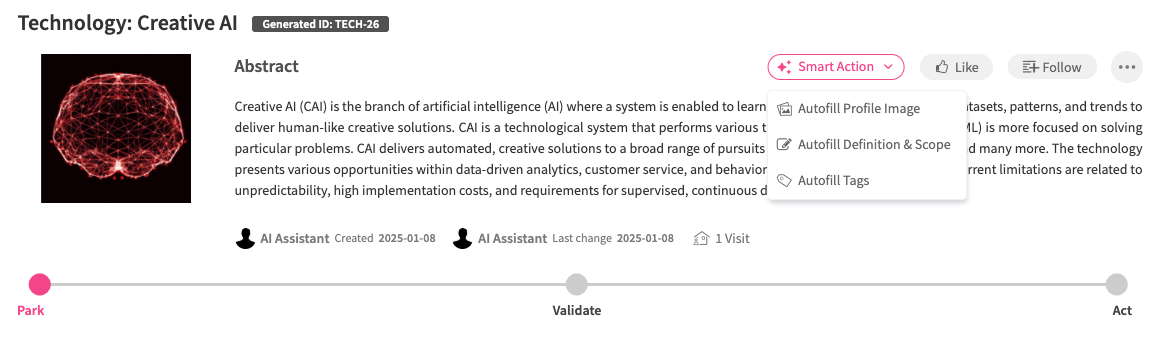 If enabled, a permitted user can navigate to the detail page of an existing element to make use of the Smart Action button to autofill relevant information using AI.