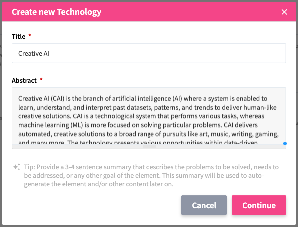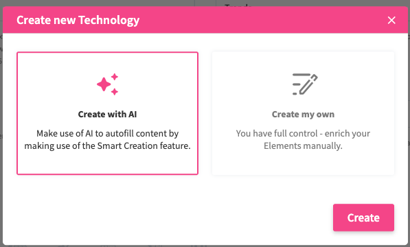 To facilitate the creation process and leverage artificial intelligence (AI), you can make use of the Smart Creation feature to let the ITONICS Innovation OS create and fill out required information for you. If the module is enabled, on the modal to create a new element of a particular type, the option Create with AI will become available for permitted users. Note that this functionality is optional, and you can continue creating your own element from scratch.