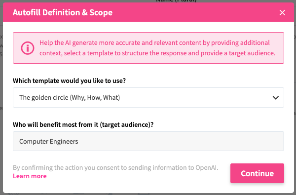 - To provide an output tailored to your needs and following a certain structure or methodology, the system will ask for the selection of one of the predefined templates (e.g. the golden circle - Why, How, What). Choosing a template will open another input field, asking for information about the target audience, again required to ensure the creation of a precise, relevant Description.