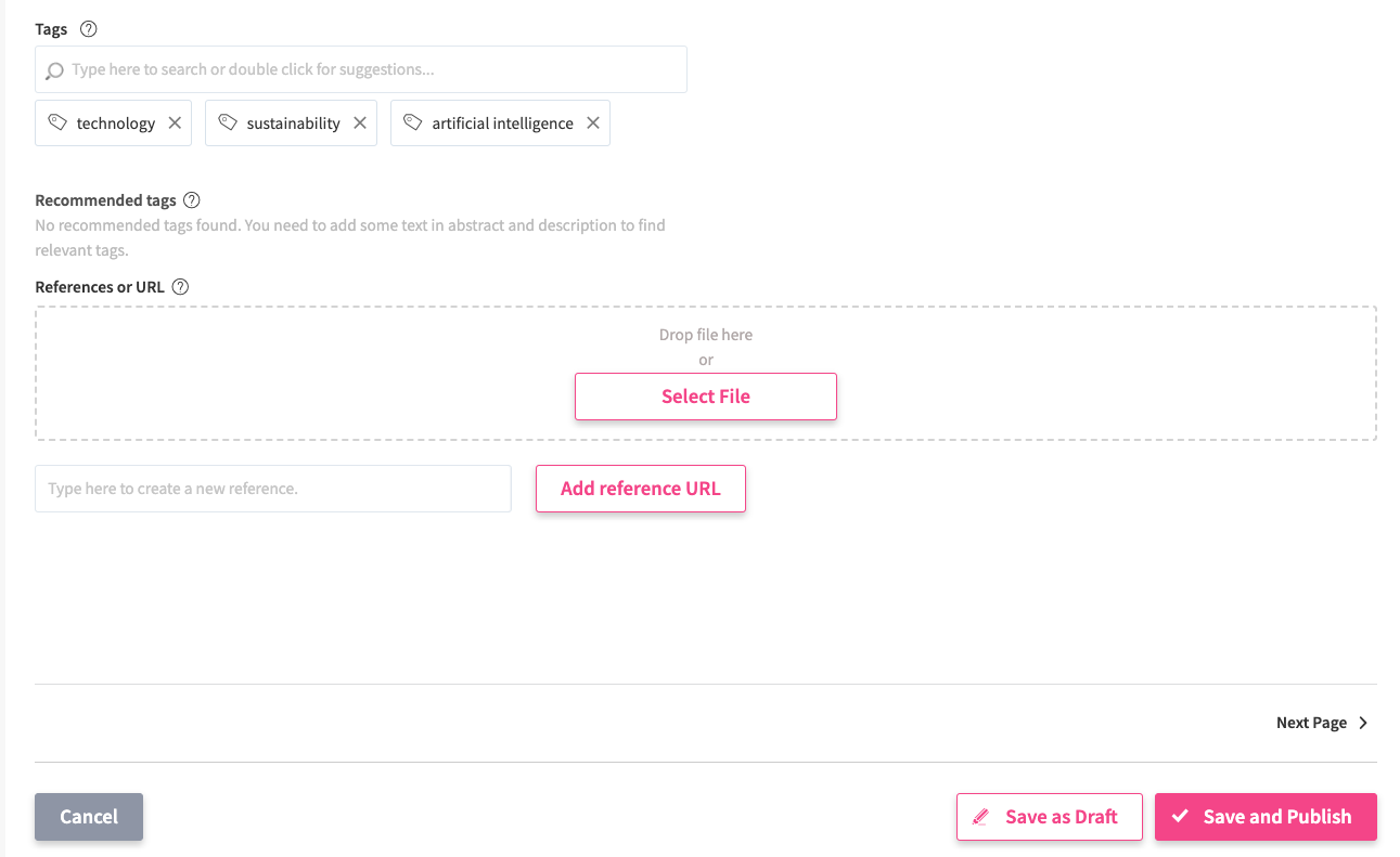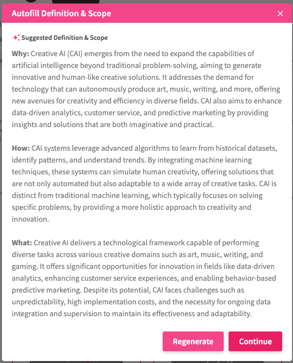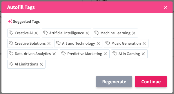 - Subsequently, you are forwarded to the Autofill Tags step. Again, Title and Abstract will be used as context, automatically generating relevant Tags. You can either Regenerate the Tags if not meeting your expectation, or Continue the selection if sufficient, forwarding you to the next step.