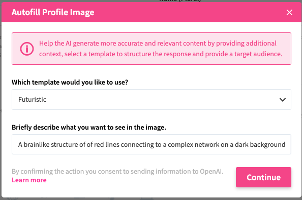 Selecting Create with AI and confirming by clicking Create will open a creation wizard guiding the user through the process of autofilling the Description, Tags, and Profile Image information. Again, the basic inputs to be able to autofill the mentioned field information and generating an image are the Title and Abstract information. The AI will utilize those as context inputs to automatically craft the desired content.