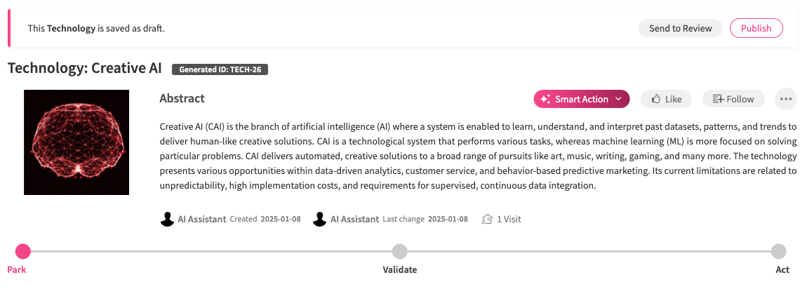 Navigating to the element’s detail page, you will notice that the element is in Draft mode, while the Created and Last change information are indicated as AI Assistant, indicating that the idea has been created with AI. If permitted, you can utilize the element-specific timeline to trace back the specific user who has initially saved the element as a draft and utilized AI to do so in the process. Note that once the element is published, the user actually publishing the element will be set as the Creator.