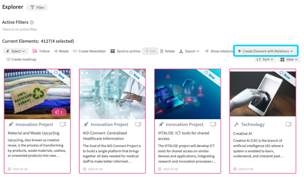 After you have created an element, you can always change the information around it. See here how to edit an element. To see all existing elements and/or perform specific actions on them, go to the Explorer.