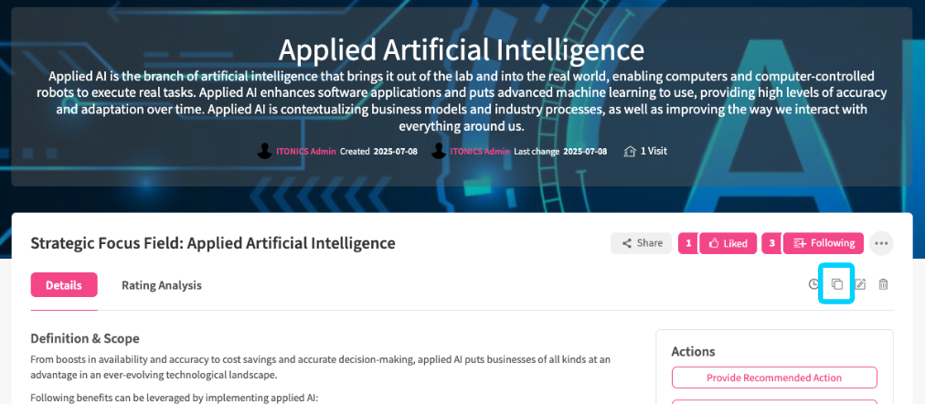 It might be that you want to create content that is similar to content that is already existing in the application. To create new content as a copy of an existing content element, open the source's detail page. If permitted by your Application Owner, you will find the copy icon on the right side in line with the tab(s).