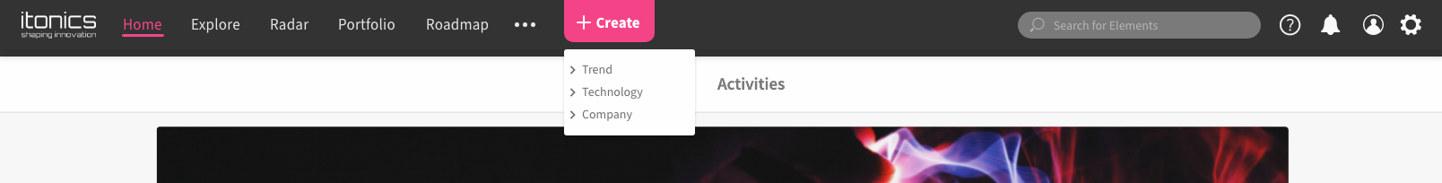 Depending on your user role and the licenses purchased, the ITONICS application provides users with different options to add content. Below, you will find all possible options to add content.