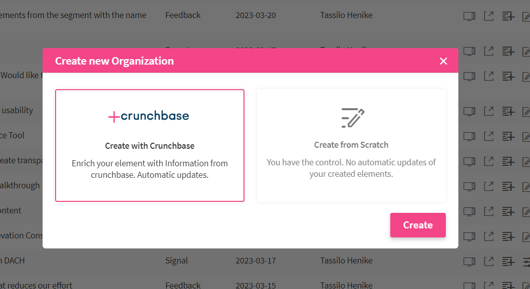In this case, hover over the "+create" button and find the content intake option for which the connection has been enabled. Usually, the displayed option refers to a name, such as company, organization, start-up, or partner. Click on the respective option and you will see a pop-up appearing which will ask you to either query the connected company databases or to start your content intake from scratch.
