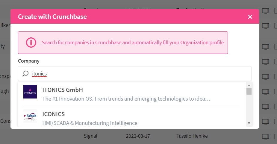 If licensed by your organization, the ITONICS system provides native integrations to company databases, such as Crunchbase and Traxcn. In this case, you will not need to fill all information fields on your own but you can source the respective information from these content providers.
