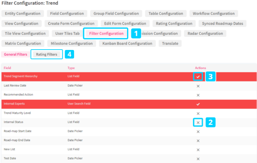 You now have the option to either disable the filter for a field (2), or re-enable the filter for a field that was previously disabled (3). Besides the General Filters for the different fields active for the respective entity type, you can also enable or disable particular Rating Filters according to your need (4).