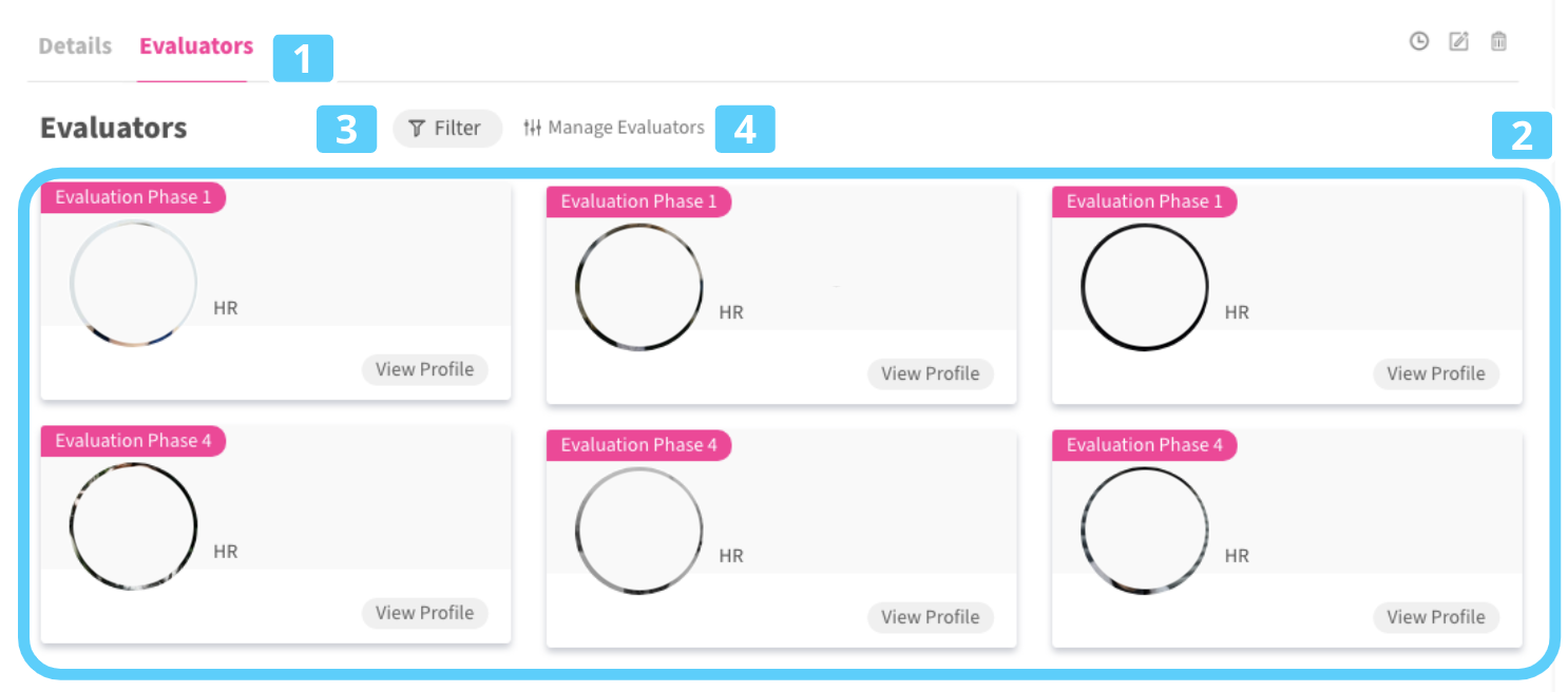 Use the Evaluators Overview at the bottom of the Dashboard tab to get an overview of the assigned evaluators within that campaign. The evaluators' overview helps the Campaign Manager to: