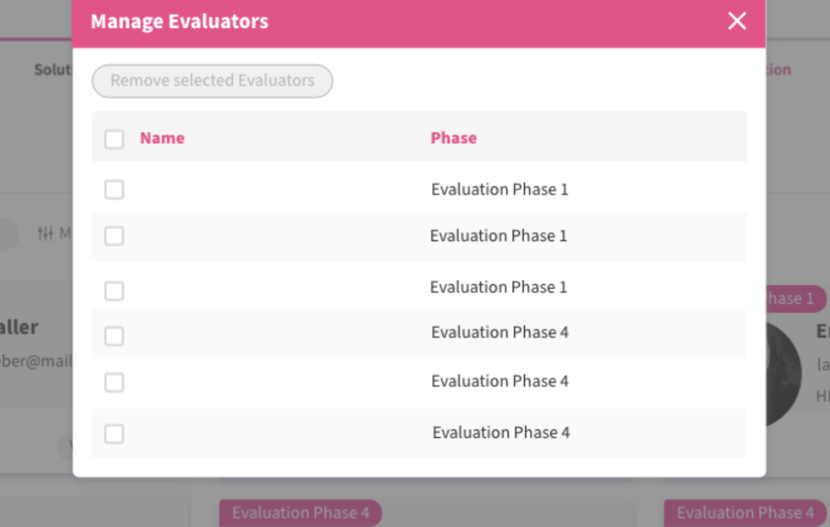Next to the Filter button, there is a Manage Evaluator button (2). Clicking on it opens a popup that lists the Evaluators of the active rating phase. You can check multiple users and click the Remove selected Evaluators button at the top of the popup window.