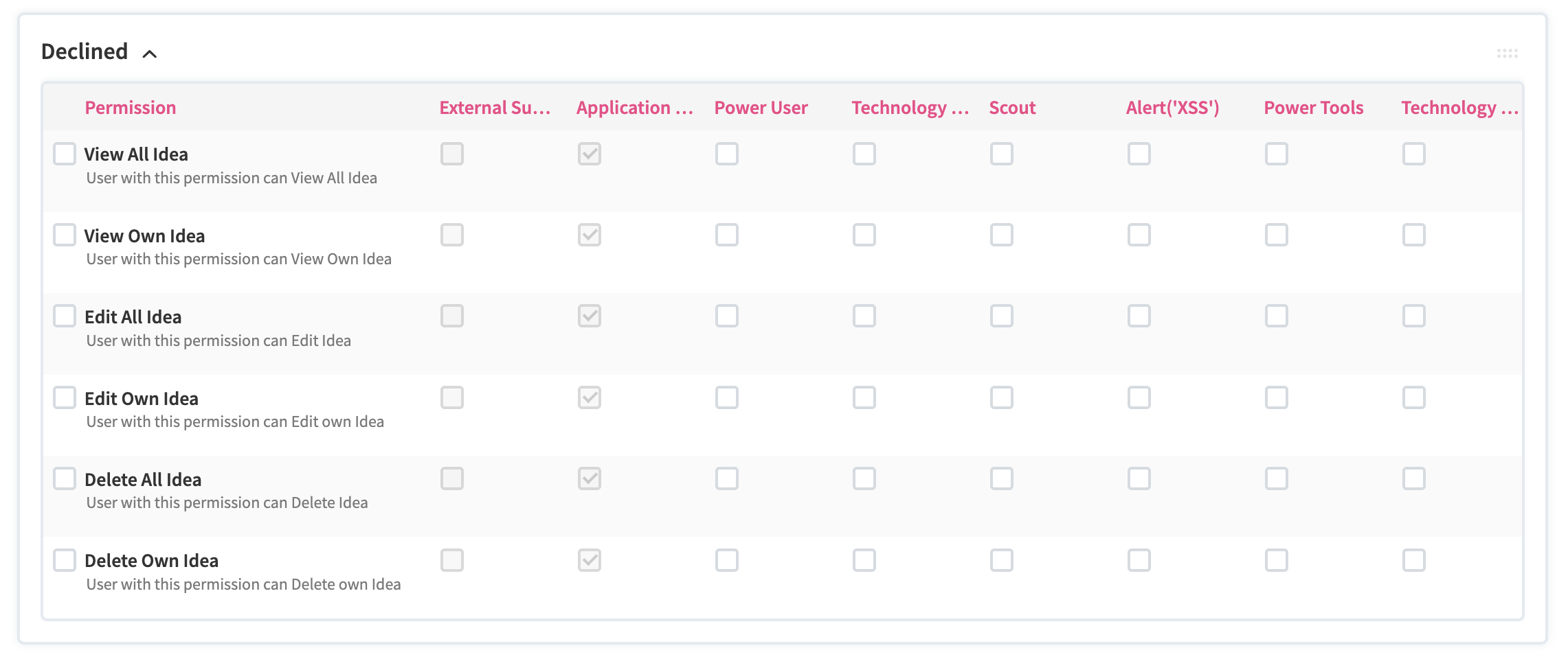 To keep a clear overview of valid and sound ideas and store those in a dedicated phase, the optional functionality to decline, but also restore submission elements can be activated. Within the create respectively edit form of a campaign element, under the Workflow Configuration tab, the Allow users to decline ideas option can be checked. Once activated, a new Declined phase becomes available at the bottom of the Workflow Configuration page. Clicking on the phase panel will open the permissions (view, edit, and delete action for declined submission elements) to control the access to the decline functionality across the available user roles. Be aware that the actual permission to be able to decline and restore submission elements is controlled by the existing Edit campaign management tab permission on campaign entity level.