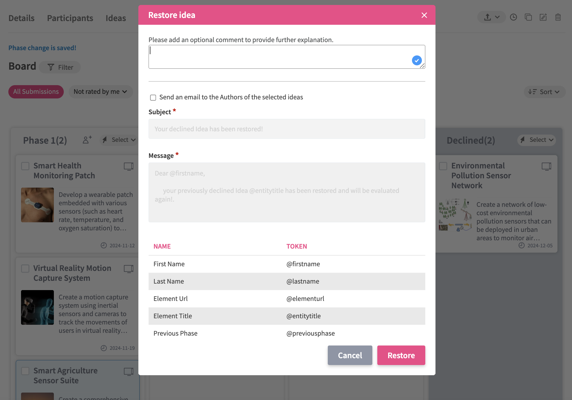 Aligned with the behavior of declining an idea element, a single submission or multiple submissions in bulk can be restored to the first phase of the respective always-on campaign by drag-and-drop action. Again, optionally, a comment and message to the assigned Authors can be provided to inform about the reasoning of the restoration of the idea.