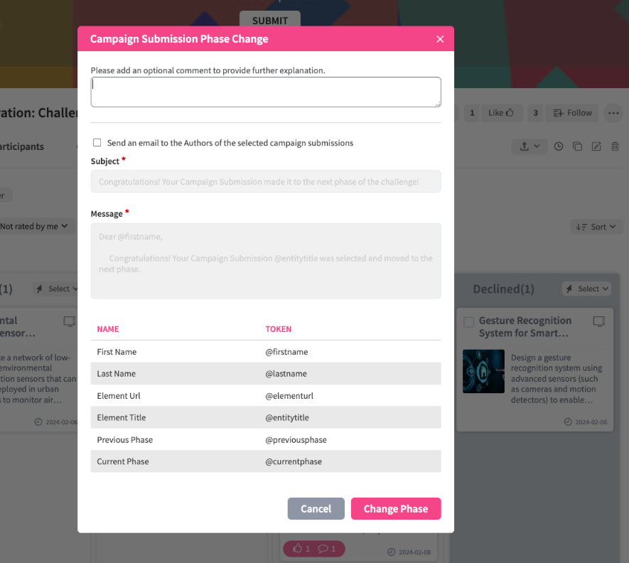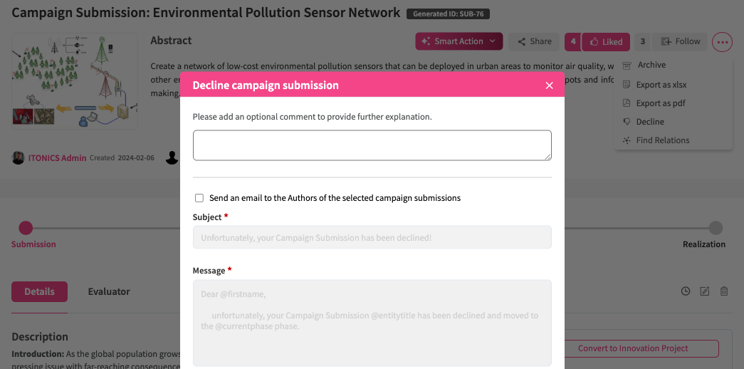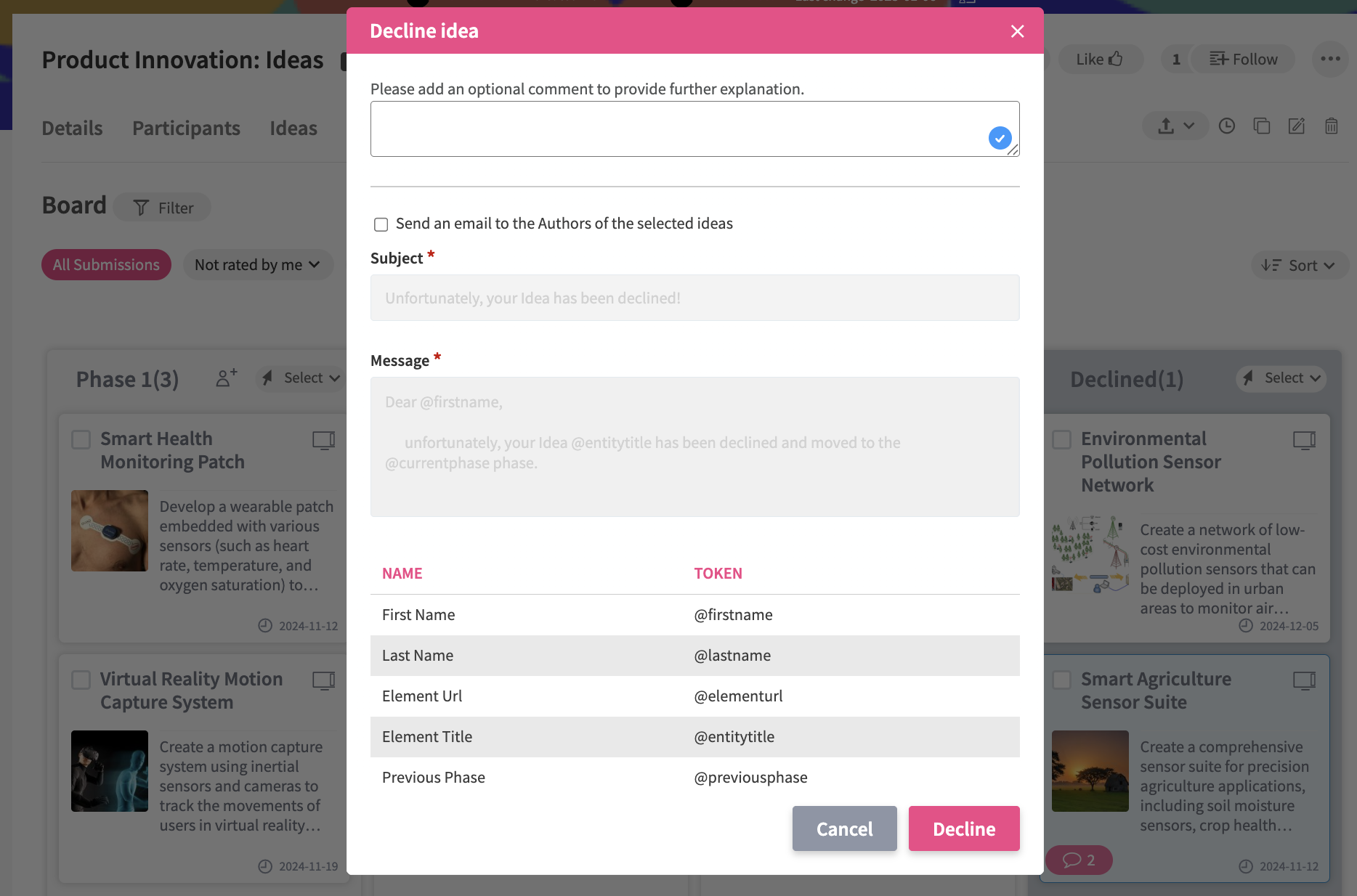 Aligned with the behavior of moving a submission element to another phase, any idea element to be declined can simply be selected via the checkbox on the submission card and moved to the Declined phase via drag and drop. Of course, it is possible to bulk select submission elements and declined those in bulk. Thereby, optionally a comment can be provided to trace back why the element has been declined, while optionally further a mail can be sent to the assigned Authors to inform about the declining of the idea.