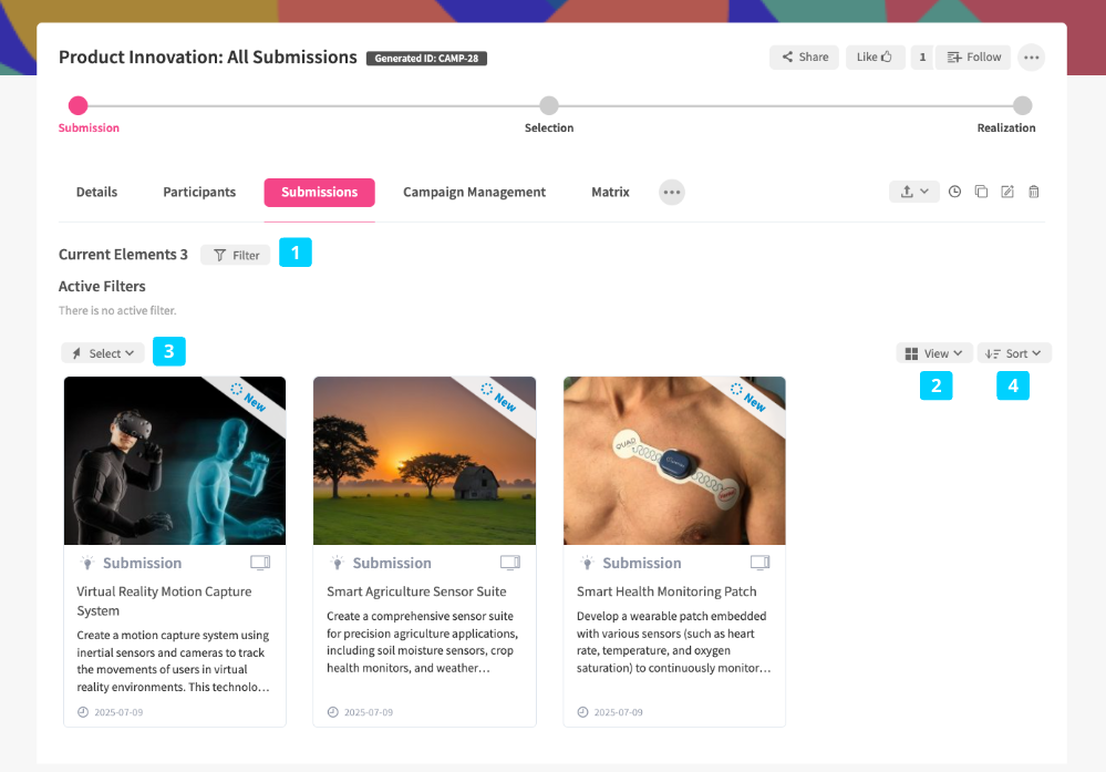 On the Submission Tab, you can browse all submissions that you are allowed to view. The view access to submissions is defined in the campaign setup and in the workflow tab by the permission "view all submissions" per phase.