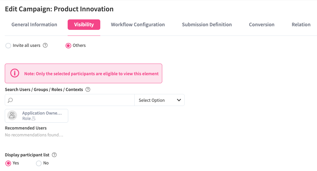 You can invite as many or as few campaign participants as you like or need. Define the scope of your campaigns individually for every new campaign. The invite is happening via the visibility tab that can be accessed while creating a campaign or using the pen icon on the campaign detail page as an Application Owner or Campaign Manager.