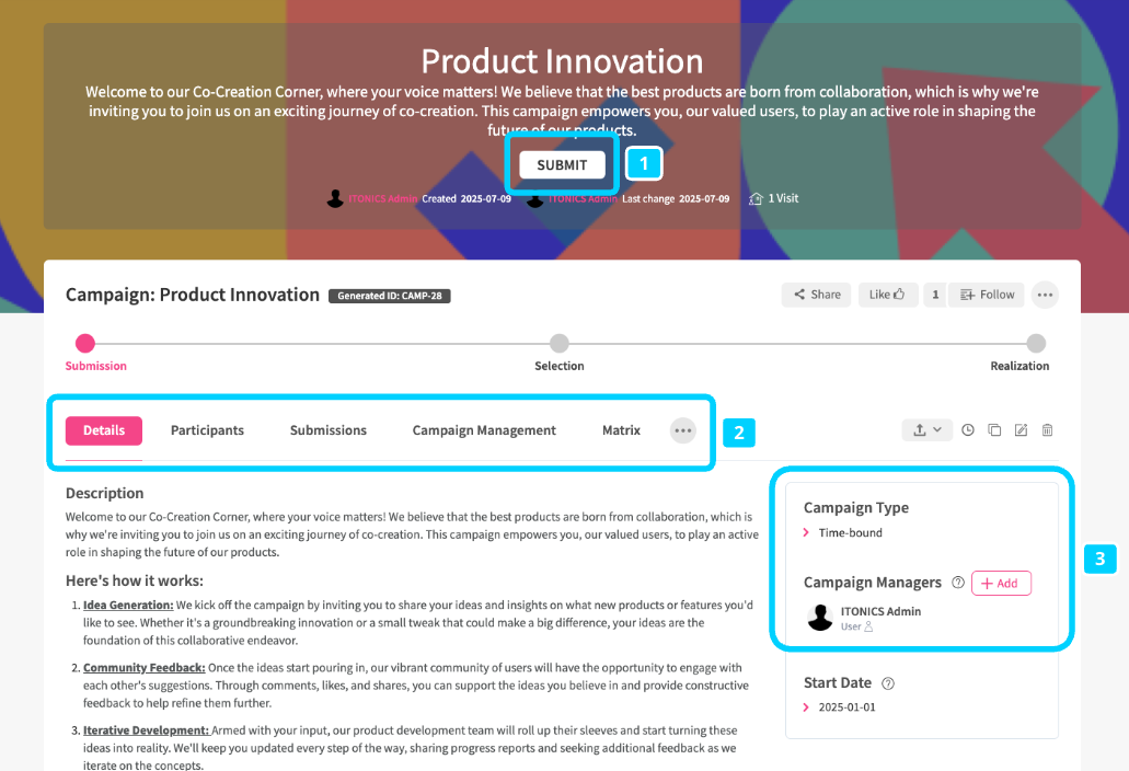 This is also the landing page for all idea submitters. If the campaign is open, i.e., the start date is passed, invited participants will find the SUBMIT button [1] that redirects a submitter directly to the idea submission form.
