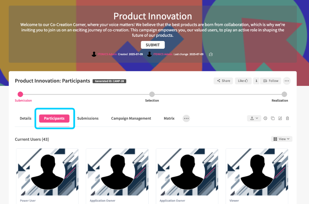 If "Display participant list" is set to Yes, everyone invited to the campaign will see a Participants tab on the element view. If it is set to No, only the creator of the campaign is still able to view the participant list.