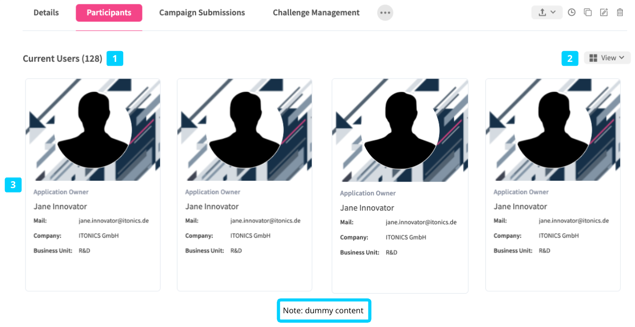 You can see the number of Current Users (1) and switch the View between Grid View and Table View (2). The user tiles show information about the users, e.g. the user roles, the name, mail address, or Business Unit. (3) By clicking on the name of a user, you get redirected to the users’ profiles, in a new browser tab.