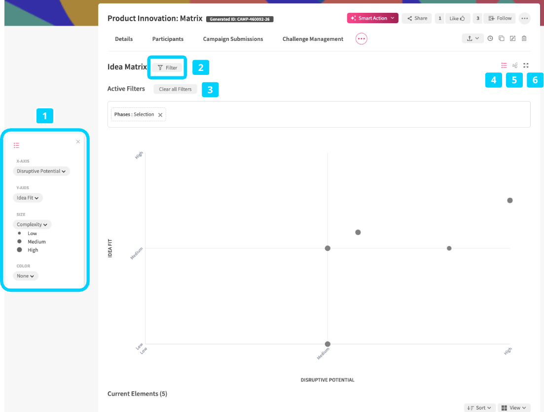 You can adjust the Settings of the Matrix and modify the X-Axis, Y-Axis, Color, and Size via the matrix legend on the left (1). By clicking on the Filter button, you can narrow down the list of Elements (2). By clicking on the Clear all Filters button, the filter selection will be reset (3). Click Hide/Show legend to hide or show the legend menu (4). Click Show/Hide labels to show or hide the element titles (5). Click Fullscreen to view the Matrix in full size (6).