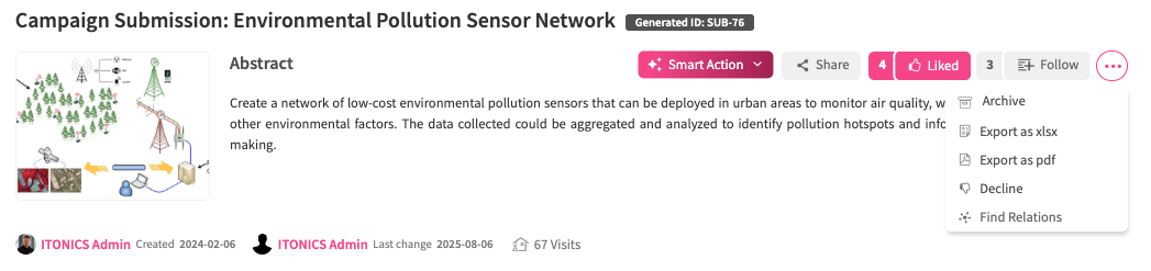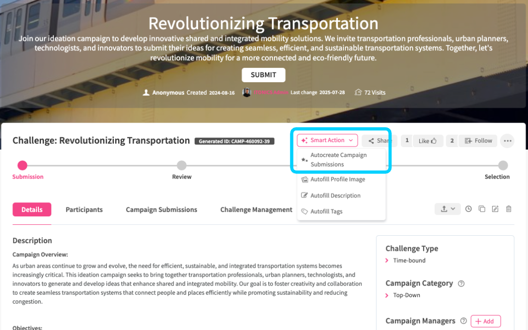 To facilitate the creation of ideas, e.g. as food for thought for campaign participants, or to leverage artificial intelligence (AI) to generate innovative ideas, you can make use of the Smart Creation feature to let the ITONICS Innovation OS create and fill out required information for you. If the module is enabled, on the detail page of the campaign, navigate to the Smart Action button and select the Autocreate Submissions/Ideas dropdown option.