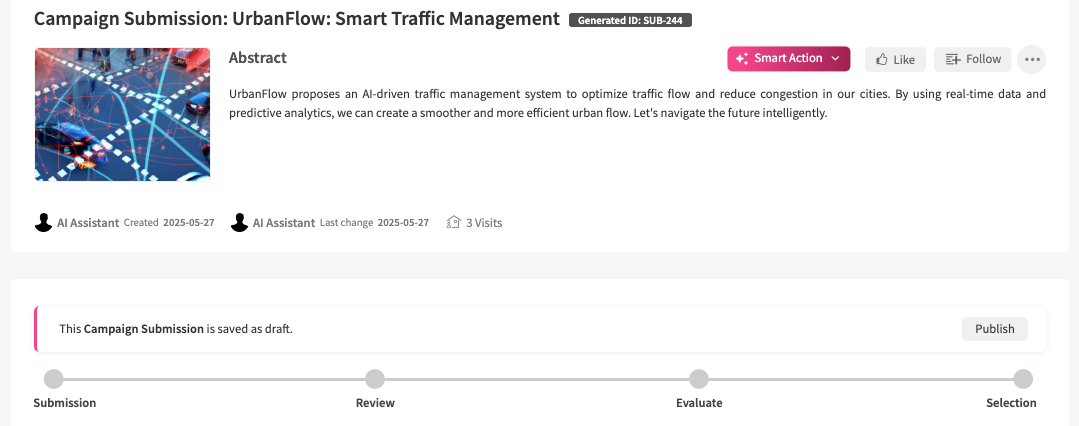 Navigating to the detail page of a particular, autogenerated submission element, the Title, Abstract, and Profile Image are autofilled. You will notice that the element is in Draft mode, while the Created and Last change information are indicated as AI Assistant, indicating that the idea has been created with AI. If permitted, you can utilize the element-specific timeline to trace back the specific user who has triggered the autogeneration of the submission element.