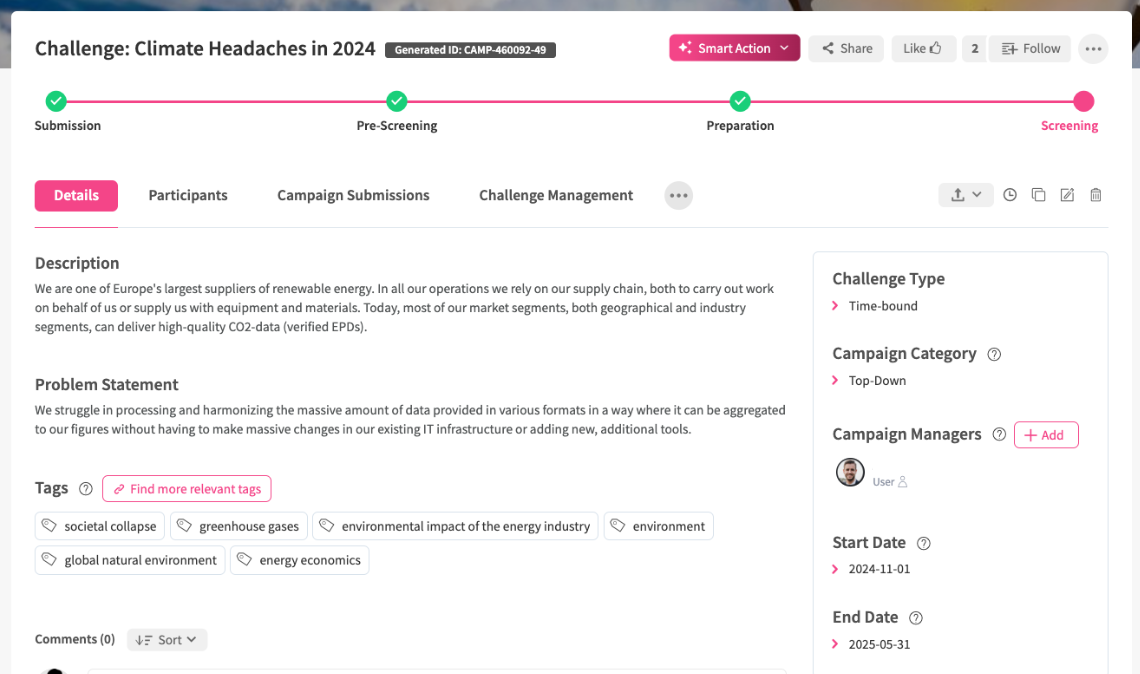 The central job of a Campaign Manager is to handle an idea campaign as smoothly as possible, i.e., attracting the right audience, taking care of submissions, engaging evaluators, making decisions along the funnel, and helping idea submitters.
