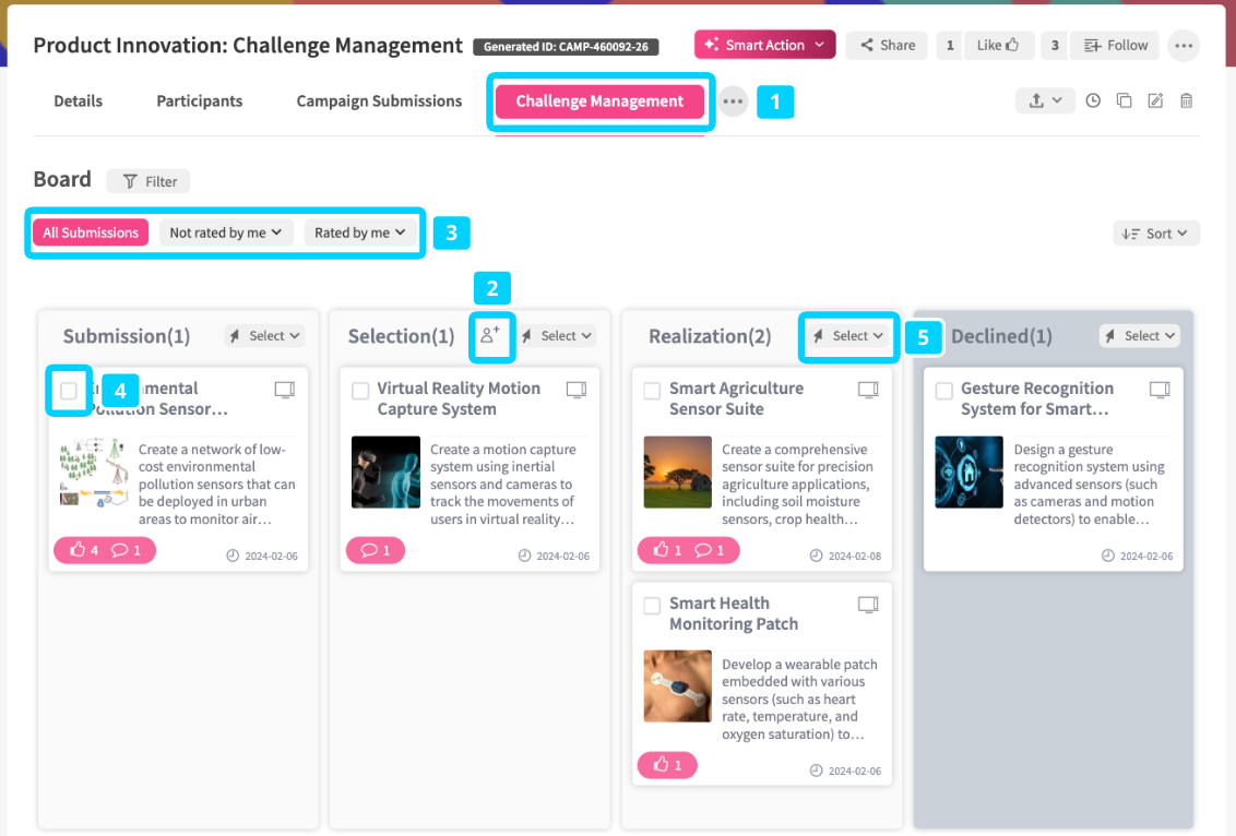To do so, you first need to filter for the submissions you want to assign. Once you have found the submissions you want to assign, click on the Bulk Assign icon on top of the Kanban Board column (4).