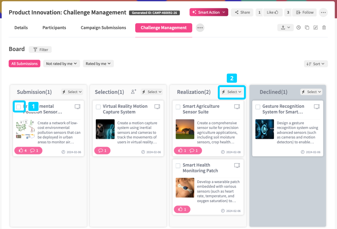 Move the idea(s) by dragging and dropping from one phase into the next, again using either the checkbox icon on a submission card (1) to select multiple individual elements or simply drag and drop one particular element to the next phase, or make use of the Select functionality (2). While dropping an idea, a popup will open, and you are asked to provide a comment or send a notification if you want to.