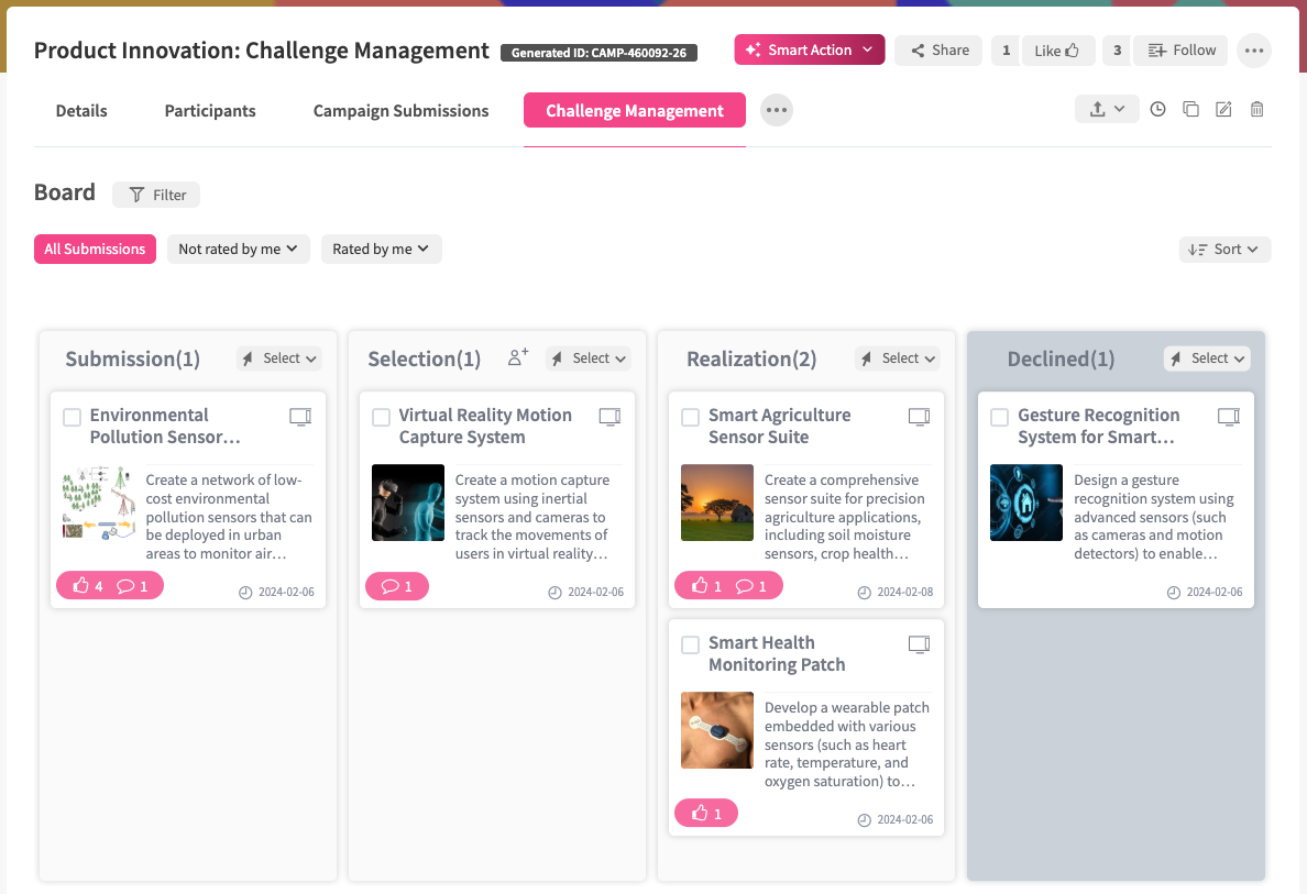 To move ideas to the next phase, navigate to the Campaign Management tab. Here you can choose which ideas to move to the next phase by using the drag-and-drop functionality. You can also drag and drop ideas in bulk, which will save you time and reduce human errors.