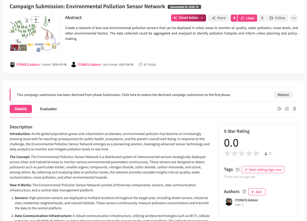 If there is the need to revive a previously declined element, e.g. because of additional information added in the meantime, permitted users will have the option to restore an idea. Note that restoration of an idea is only possible to the first phase of an always-on campaign, since a restored submission element shall be funneled back through the idea funnel.