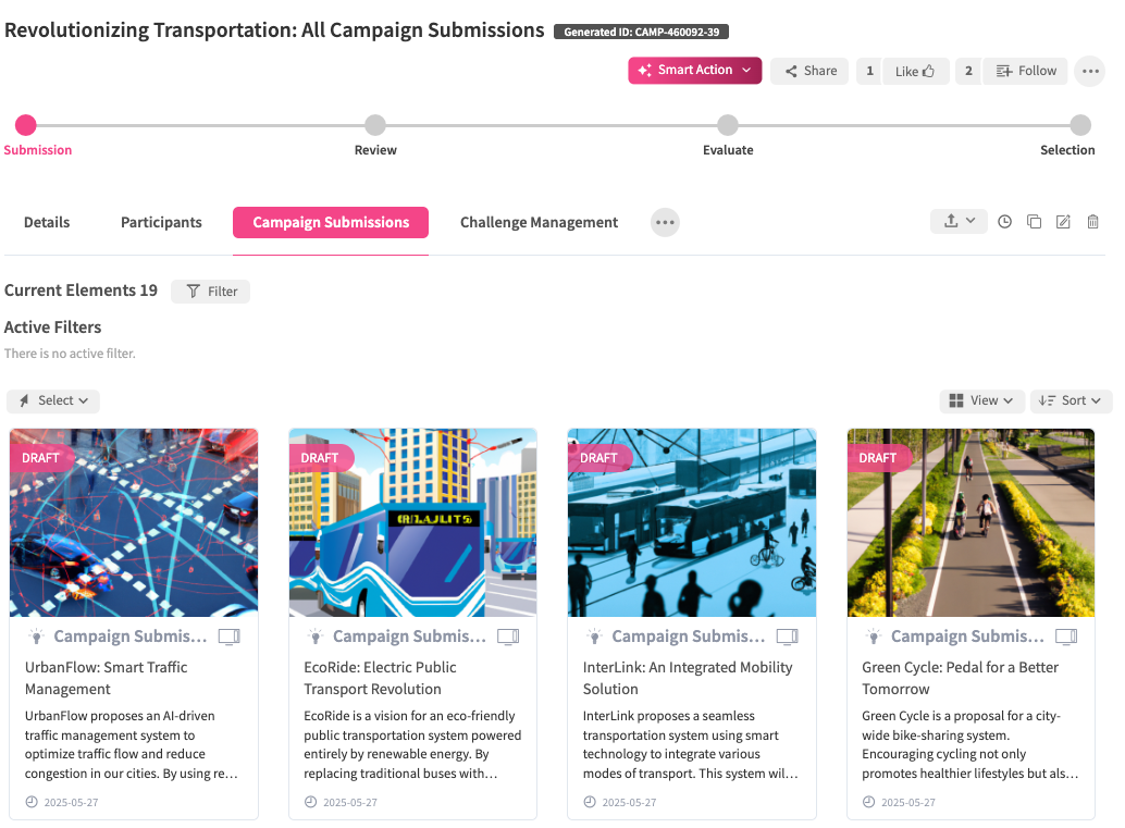 Via the Campaign Management Tab, you can filter submissions, move submissions to the next phase(s), assign bulk evaluators, and bulk rate assigned submissions. It is thus the command center of your campaign. The tab is accessible to Application Owners, the respective Campaign Managers, and assigned Evaluators.