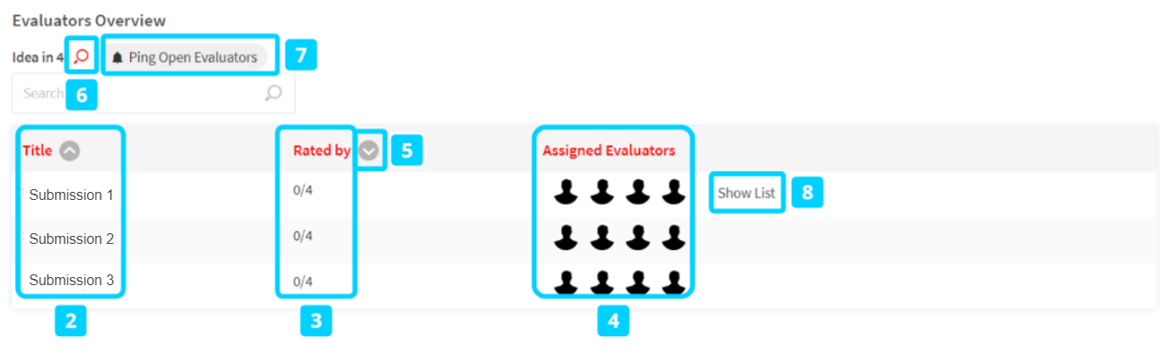 - Notify all open evaluators that they have pending rating tasks in any submission in a specific phase by clicking the Ping Open Evaluators button (7).