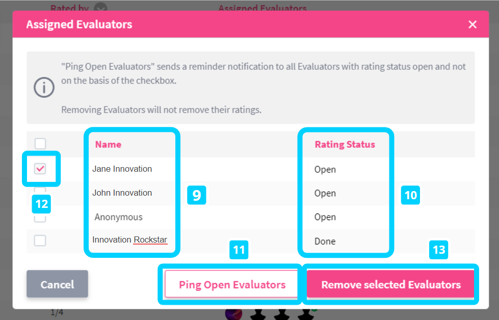 - Notify all open evaluators that they have pending rating tasks on a single submission by clicking the Ping Open Evaluators button (13) in the Assigned Evaluators modal of a single submission.