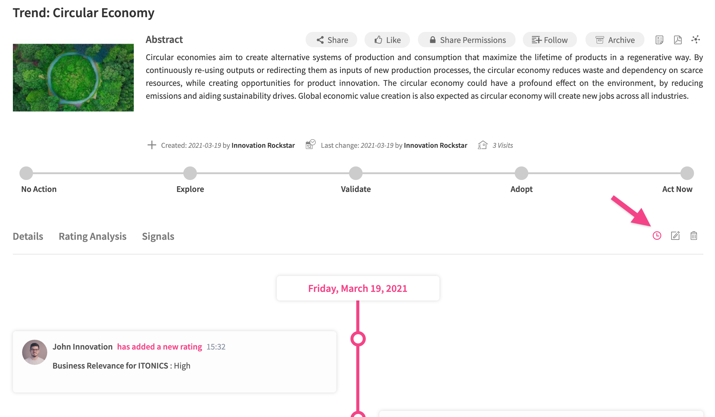 You can see changes made on each element on a timeline located on its detail page. To see these changes, open the selected element detail page and click the Clock icon located on the upper right side.