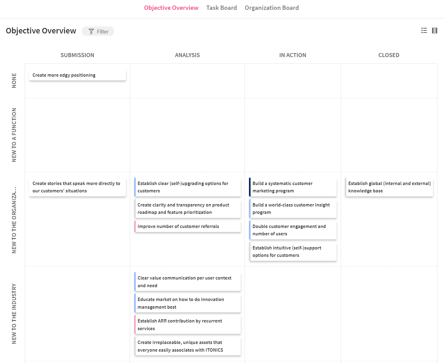 Many co-workers will face different challenges in their daily work. Plus, new business challenges might also arise from your external environment and a shift in consumer behavior/desires, political initiatives, or technological advancements. While the latter usually is part of your competitive intelligence activities, uniting this external and the former internal perspective provides you with the opportunity to unite these views and identify the most pressing business challenges.