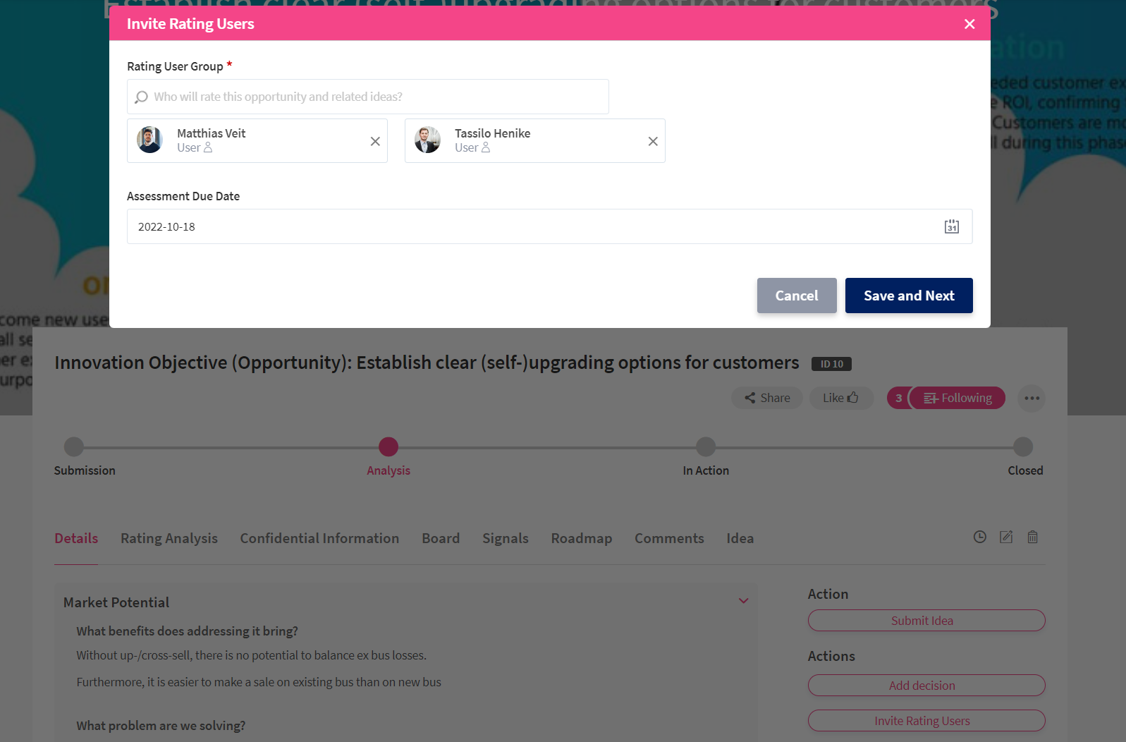 If you use a pearl chain field and use the workflow configuration, you can steer the necessary actions per phase and by including different individuals along the way. For instance, you can add an action button "invite evaluators". By using a user search field, you can name the evaluators and send a notification to them to ask them to submit their rating of the challenge. This will help you afterward to prioritize the follow-up actions on the challenges identified.