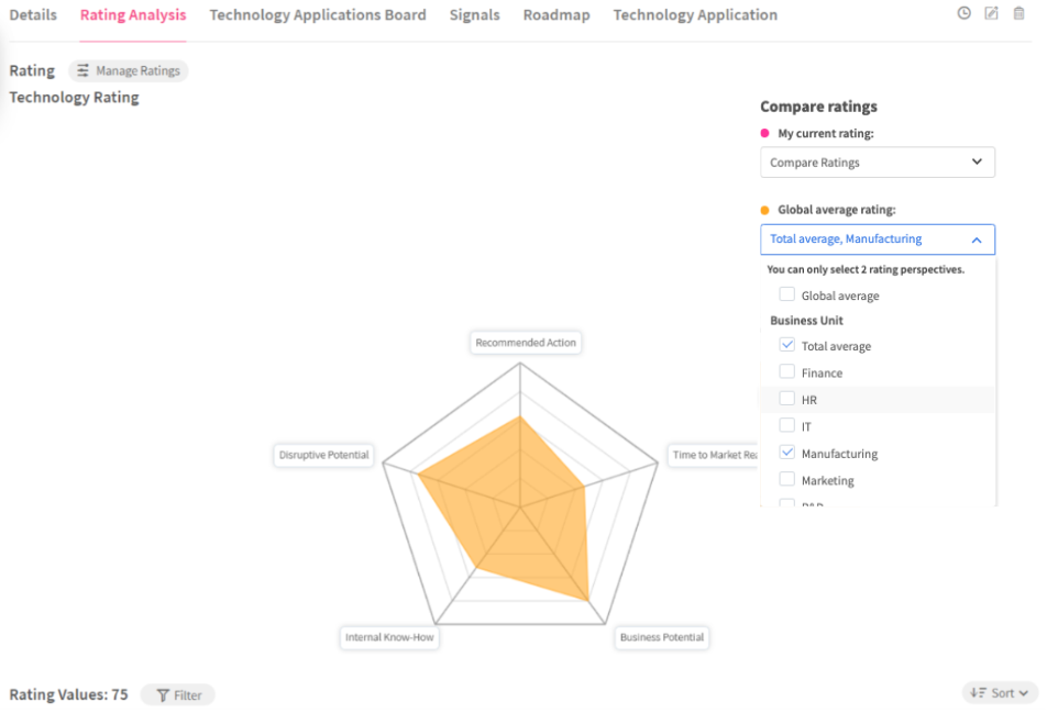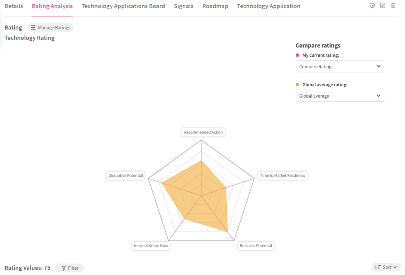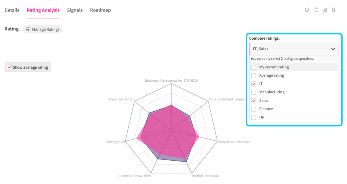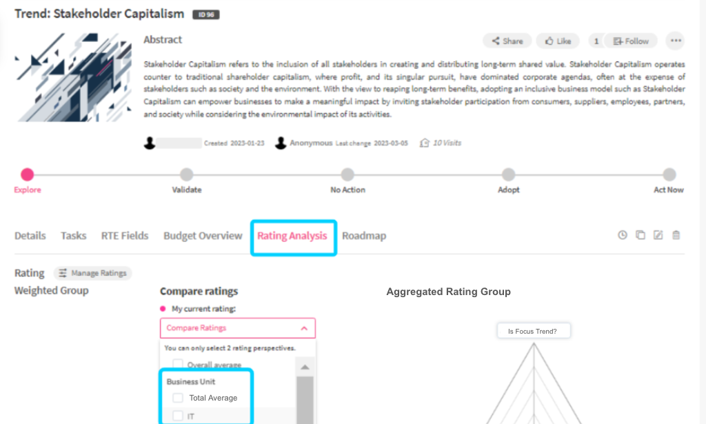 Now, if a user rates any element such as a Trend, this rating will of course play into the overall aggregated rating for that particular element. However, the context in which this person rates will also be stored and considered. This can now easily be used and assessed by using the Rating Analysis tab. There you will find a field called Compare ratings. This field allows you to select the context in addition to the Average rating and My current rating.