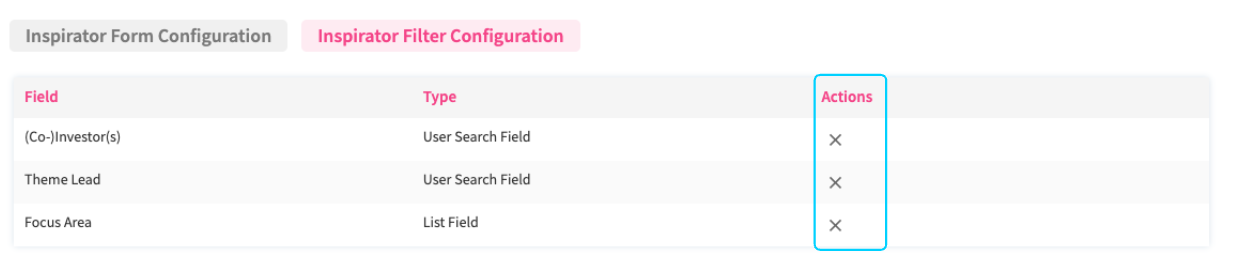 Within the Inspirator Filter Configuration, you can configure for which fields a filter should be available for the corresponding entity type in the Inspirator app. Hereby, the selection works similar to the Filter Configuration, where under the Actions column click the “X” icon to disable the particular filter. Vice versa, clicking on the “check mark” icon of a disabled filter will allow you to re-enable it.