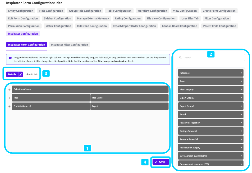 Within the Inspirator Form Configuration sub tab, similar to the View Configuration or (Edit/Create) Form Configuration, a configuration page opens with a backlog of available fields on the right (2). Drag and drop the desired fields into the form editor (1) on the left side to configure the form layout for the respective entity in the Inspirator app. To align a field horizontally, drag the field itself, or drag two fields next to each other. Use the drag icon on the left side of each field to change its vertical position. Note that the positions of the Title, Image, and Abstract are fixed. If required, you can adjust the wording of the primary tab, or add a new tab (3). Do not forget to click Save to confirm the form layout (4).
