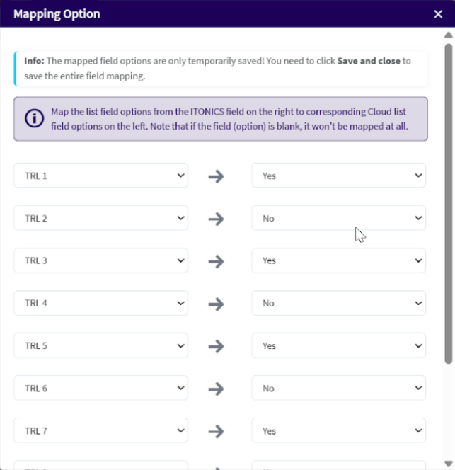 If a matching ITONICS Cloud field is missing, the mapping cell will appear empty.