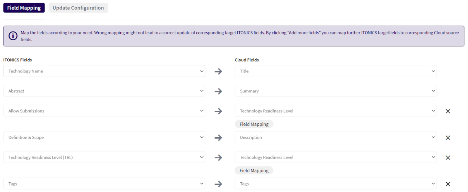 For each ITONICS Enterprise (Nucleus) field, you can select a matching ITONICS Cloud field of the same type.