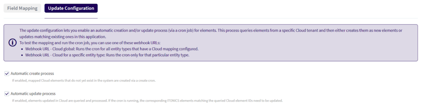 Webhook URL (global): Applies to all entities with ITONICS Cloud integration enabled