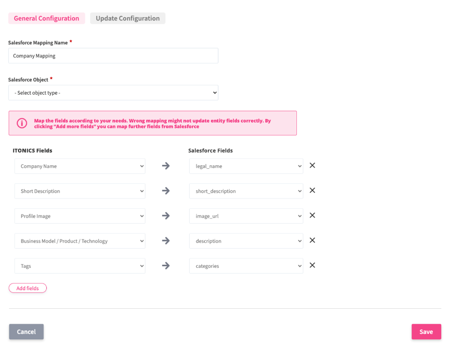 Map the fields you have configured on the entity in ITONICS to the fields that are available for your Salesforce object. These are the fields that will be updated accordingly from your Salesforce data.