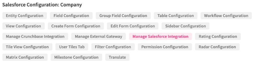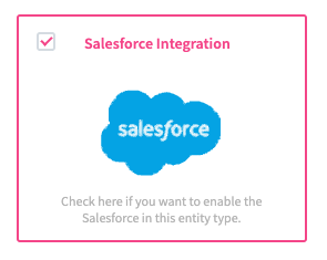 In order to activate the Salesforce Integration on an Entity Type, go to the Entity Configuration and choose an Entity to activate from your Entity Manager. Within the Entity type, you will now have access to a module/feature called Salesforce Integration.