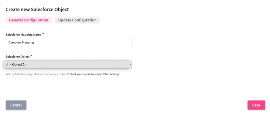 Within the Manage Salesforce Integration option, you will be able to Add new Salesforce Object. This option will allow you to connect the Salesforce app and choose from an object that has been made available through the app.