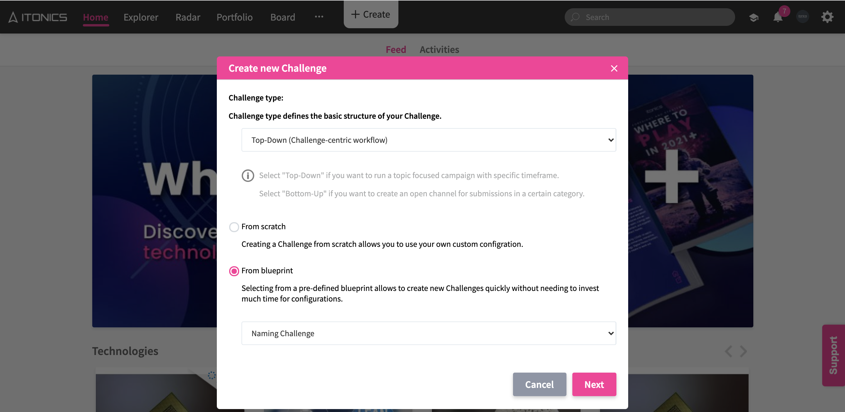 ITONICS Campaigns offers the possibility to define multiple campaign blueprints that you can use for easier campaign setup. A blueprint can come with a pre-configured campaign visibility, workflow configuration, and submission configuration.
