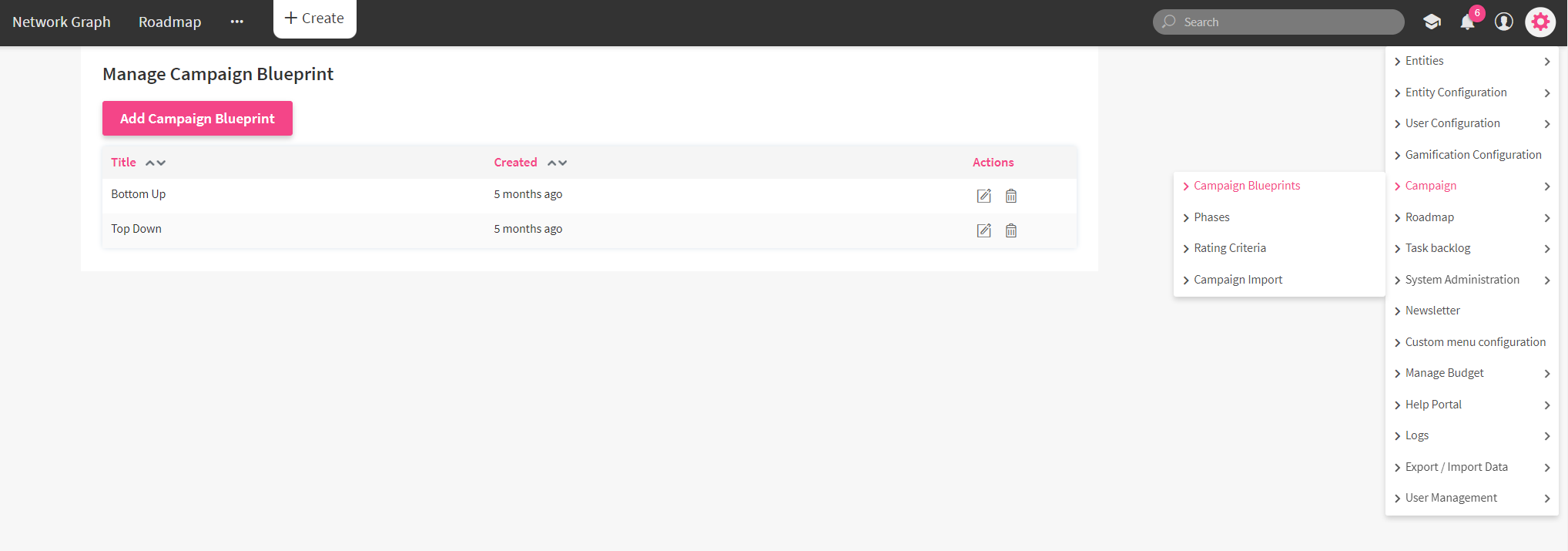 After clicking on it, you will have the option to Add Campaign Blueprint or edit an existing blueprint via the pen icon. You can also delete blueprints that you do not want to provide via the trash icon.