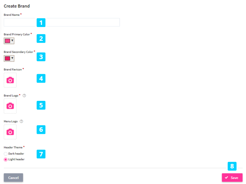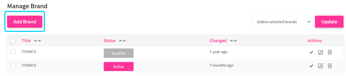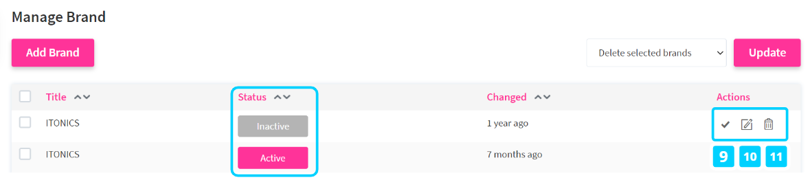 Note: only one brand can be activated at a time, and the brand-building process might take some time to be implemented. By selecting the respective brand, you can always Edit (10) or Delete (11) any existing brand from the table.